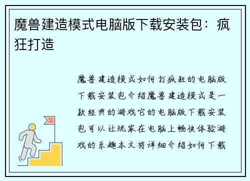 魔兽建造模式如何打疯狂的电脑版下载安装包 介绍 魔兽建造模式是一款经典的游戏,它的电脑版下载安装包可以让玩家在电脑上畅快体验游戏的乐趣。本文将详细介绍如何下载和安装魔兽建造模式的电脑版,帮助玩家顺利开...