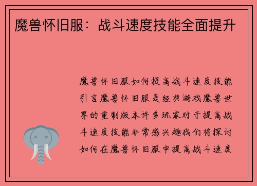 魔兽怀旧服如何提高战斗速度技能 引言: 魔兽怀旧服是经典游戏《魔兽世界》的重制版本,许多玩家对于提高战斗速度技能非常感兴趣。我们将探讨如何在魔兽怀旧服中提高战斗速度技能。我们将从以下几个方面进行详细阐...