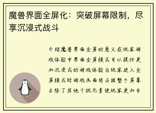 介绍魔兽界面全屏的意义 在玩家游戏体验中,界面全屏模式可以提供更加沉浸式的游戏体验。当玩家进入全屏模式时,游戏画面将占据整个屏幕,去除了其他干扰元素,使玩家更加专注于游戏内容。全屏模式还可以提供更大的...