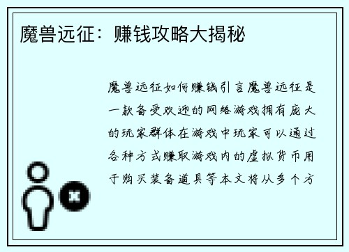 魔兽远征如何赚钱 引言 魔兽远征是一款备受欢迎的网络游戏,拥有庞大的玩家群体。在游戏中,玩家可以通过各种方式赚取游戏内的虚拟货币,用于购买装备、道具等。本文将从多个方面介绍魔兽远征中如何赚钱的方法,帮...
