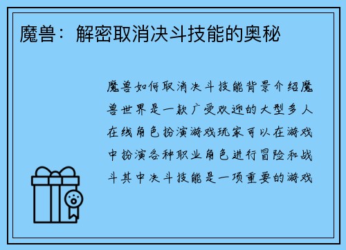 魔兽如何取消决斗技能 背景介绍 魔兽世界是一款广受欢迎的大型多人在线角色扮演游戏,玩家可以在游戏中扮演各种职业角色进行冒险和战斗。其中,决斗技能是一项重要的游戏机制,允许玩家在游戏中与其他玩家进行一对...